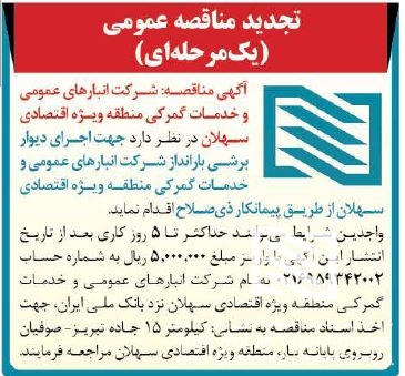 شرکت انبارهای عمومی و خدمات گمرکی منطقه ویژه اقتصادی سهلان در نظر دارد جهت اجرای دیوار برشی بارانداز منطقه ویژه اقتصادی سهلان از طریق پیمانکار ذی صلاح اقدام نماید.